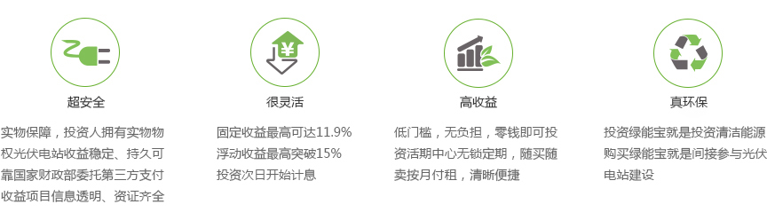 绿能宝(Solarbao),全称为江苏绿能宝融资租赁有限公司,是由美国纳斯达克上市企业SPI绿能宝能源互联网股份公司斥资5亿美元倾力打造的互联网创新金融服务品牌。以实物融资租赁为商业模式,专注于太阳能光伏发电全套解决方案,倡导人人参与并因此受益的绿色理念,为用户提供安全、灵活、稳健的投资收益产品。